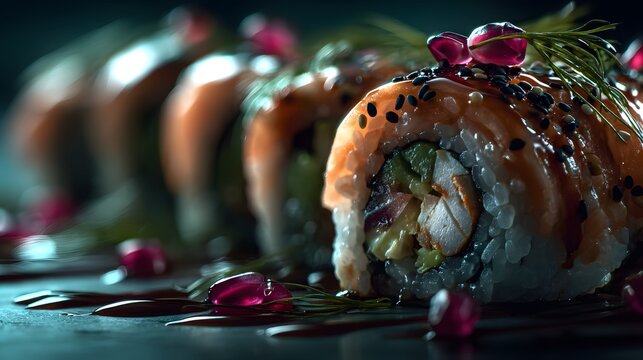 Sushi rolls with sesame and glaze on elegant plate under blue lights, perfect for restaurant menus, upscale food blogs