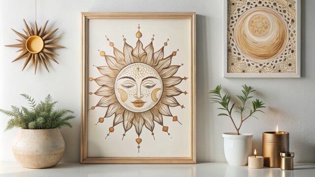 Abstract sun moon print with boho geometric design for printable wall art , sun, moon, print