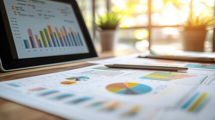 Two smiling business colleagues are collaborating on a project, analyzing financial charts and data displayed on a digital tablet and printed documents, working together at an office desk