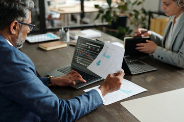 Middle aged Caucasian man analyzing financial charts on laptop while holding printed graphs, sitting at desk with middle aged Caucasian woman using digital tablet in office workspace