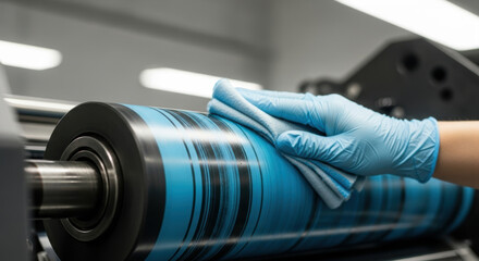 Gloved technician cleans rotating printing press cylinder using microfiber cloth to ensure precision maintenance and smooth industrial production operation
