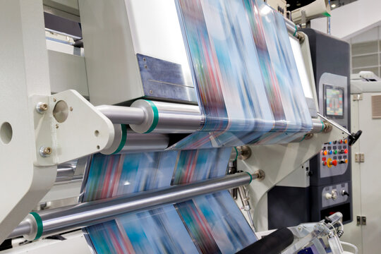 new innovative technology of automatic label printing machine with digital control panel. printing on continuous plastic film for wrapping on food product packaging in the printing factory.