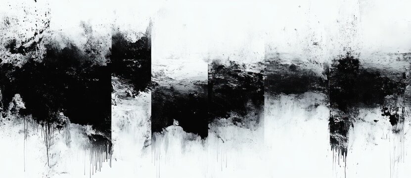 Monochrome abstract panorama of textured black bands and vertical panels with dripping ink and splattered edges, stark contrast evoking a moody, contemplative atmosphere