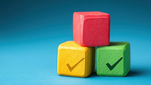 Colorful three dice displaying a tick mark as a visual representation of prioritizing outcomes and decision impact