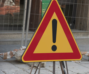 Cartello stradale stradale su contesto urbano che indica pericolo generico