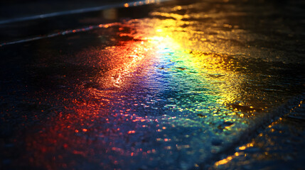Prismatic iridescent reflections featuring holographic rainbow rays, pastel light leaks, and colorful garland backdrop