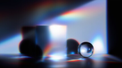 Abstract composition of a cube and sphere with refracted light spectrum creating a prismatic effect on a dark background.