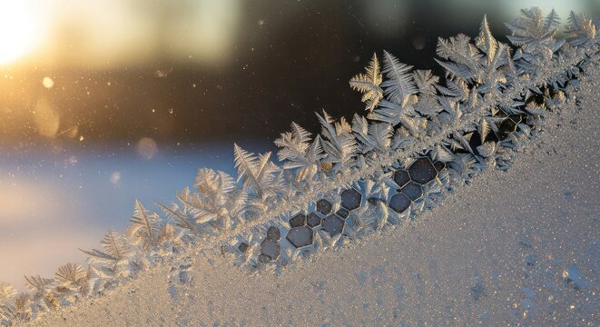 Ephemeral beauty, intricate ice crystal formations on glass, bathed in golden sunlight, a winter