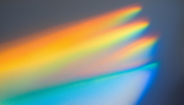 Iridescent white background with rainbow light rays and prismatic lens flare. Soft-focus bokeh effect creating a dreamy and ethereal atmosphere with chromatic aberration and blurred textures.