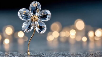 Blooming crystal flower on a delicate twisted gold stem standing on a textured surface with bokeh lights in the background