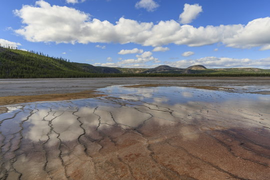 Grand Prismatic Spring reflections with Twin Buttes, Midway Geyser Basin, Yellowstone National Park, Wyoming