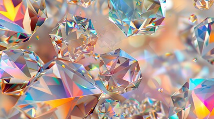 An artistic depiction of floating crystals, gleaming with colorful reflections, capturing their multifaceted nature and the prismatic interplay of light on their surfaces.