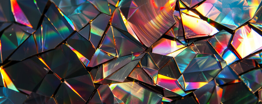 Shimmering holographic foil scattering light macro with prismatic bokeh and pixelated grid