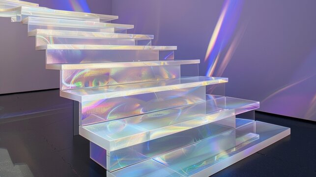 Prismatic crystal structures illuminated by beams of light, resulting in an explosion of colorful reflections and creating an enchanting and surreal visual experience that captivates the viewer.