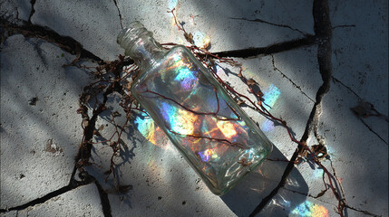 Shattered sunscreen bottlerefracting prismatic lightwith dark vines emerging trough cracks.