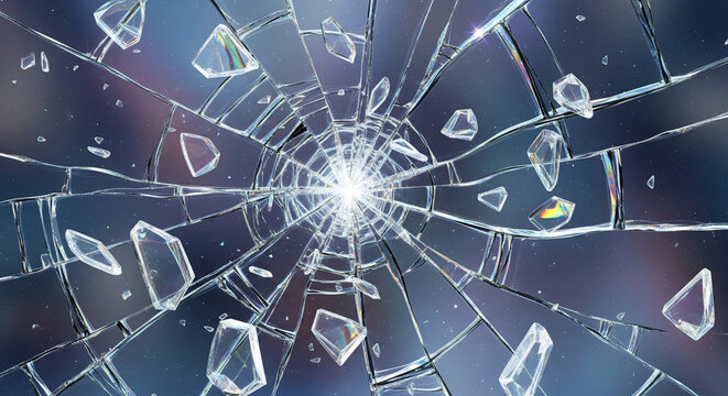 Showing shattered glass pane with impact center in studio, refracting red orange blue purple light