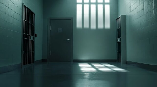 The chilling, blue-hued image of a prison corridor at night, with closed cells on either side, conveys a feeling of solitude