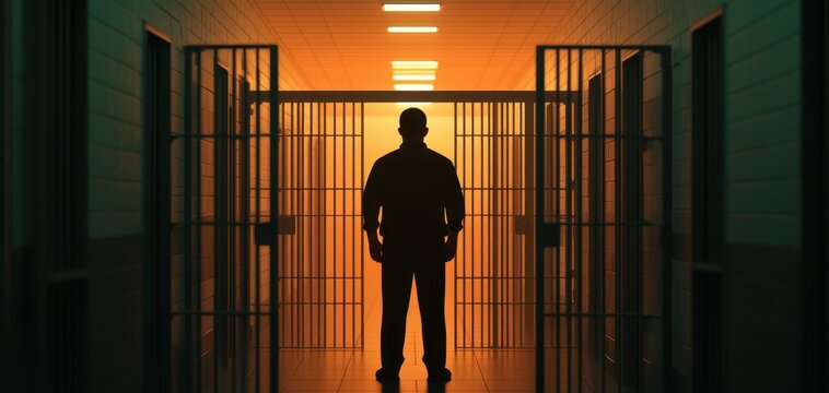 A silhouette of a correctional officer stands guard in a dimly lit prison hallway, ensuring security and maintaining order within the facility.