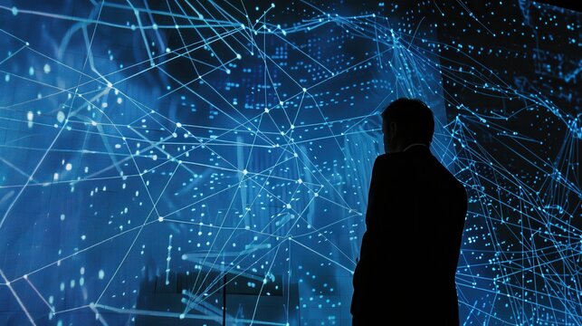 A dramatic depiction of an IT professional silhouetted against a large AI neural network diagram, pinpointing data privacy issues.