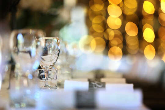 Formal wedding place setting on long table background