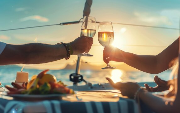 Romantic Sunset Dinner on a Yacht: Couple Toasting with Wine Overlooking the Ocean