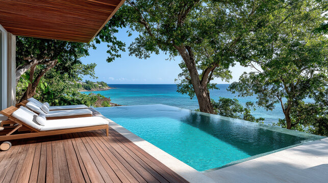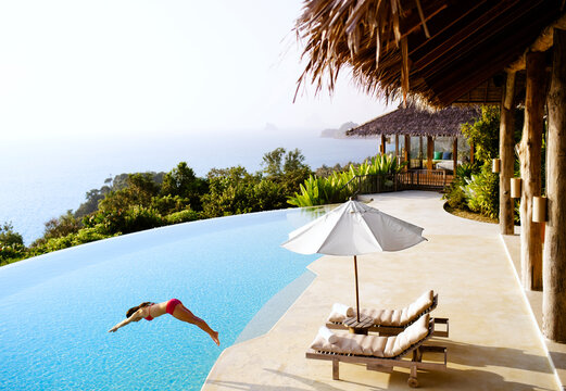 A woman dives into a private luxury infinity pool  overlooking Phang Nga Bay, Yao Noi, Thailand.