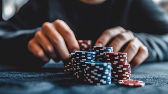 man's hands holding a stack of colorful poker chips at a casino table. The image conveys tension, strategy, and the thrill of gambling and risk-taking