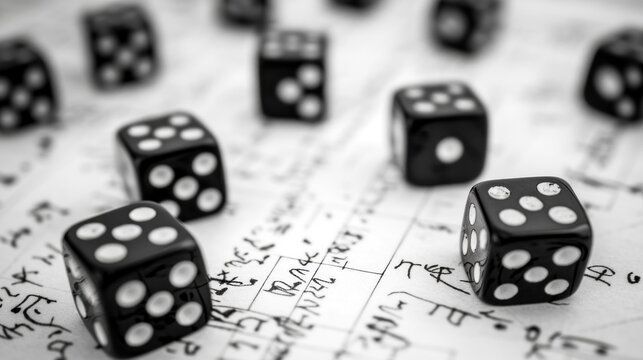 Black dice scattered on a game sheet