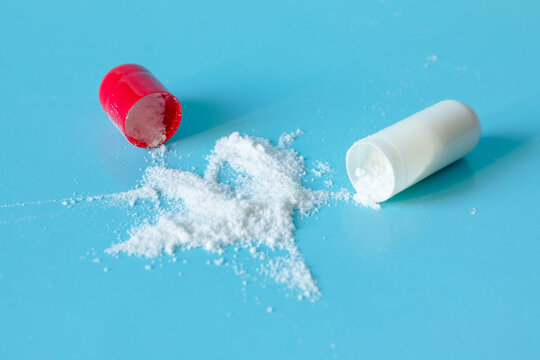 a white powder, drug, or drug spilled out of the capsule shell. close-up