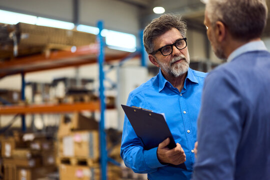 Two Businessmen Discuss Operations Inside a Warehouse Environment