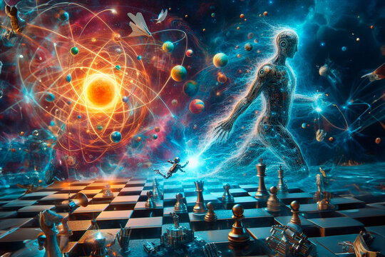 Artificial intelligence embarks on a cosmic chess journey amidst celestial bodies