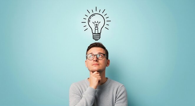 Man pondering with lightbulb above head symbolizing idea concept, creative thinking, problem-solving, brainstorming, innovation, inspiration, solution