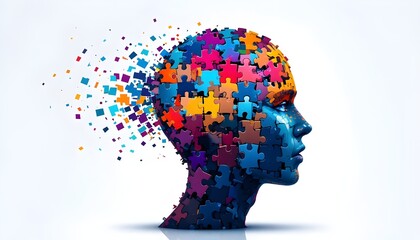Colorful jigsaw puzzle forming a human head, symbolizing mental health, creativity, and problemsolving skills
