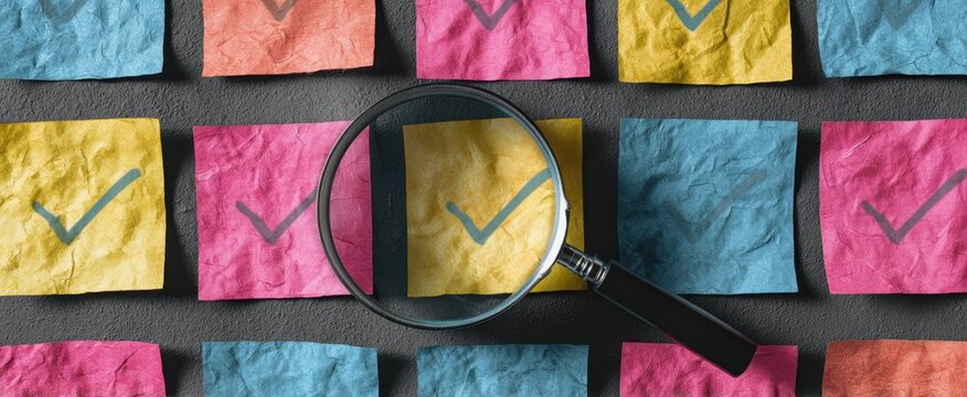 The Magnifying Glass Highlighting a Checked Sticky Note in Colorful Grid