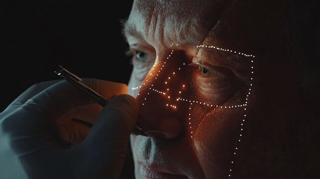 Close-up of a woman's face with cosmetic markings for a procedure.