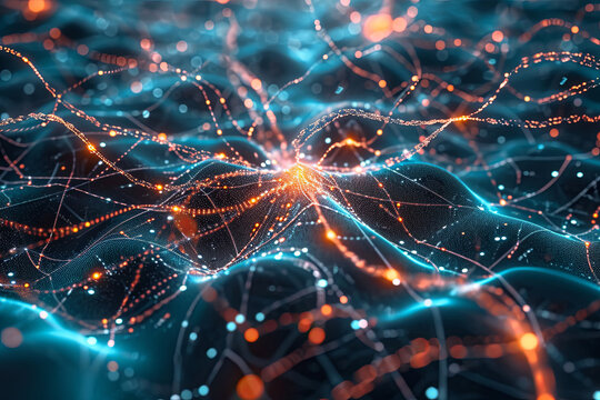 Glowing neural network and futuristic brain connections representing intelligence,digital technology,and cognitive processing concepts. Abstract visualization of neural pathways,synaptic activity.