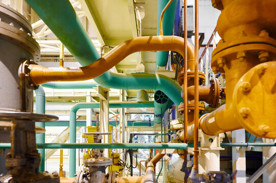 View of industrial pipes and valves in a processing facility with extensive plumbing arrangement
