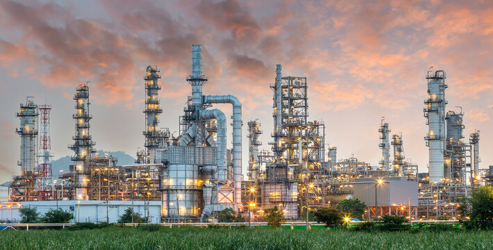 Pipeline and pipe rack of petroleum industrial plant with sunset sky background
