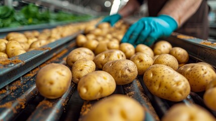 Workers sort freshly harvested potatoes on a conveyor belt, ensuring quality control in a bustling agricultural processing facility