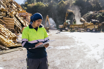 Waste management worker writing notes on clipboard while supervising recycling operations in junkyard