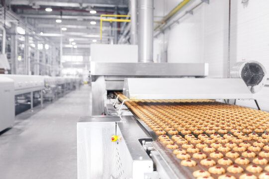Conveyor line for production cookies at confectionery factory. Modern plant for biscuit.