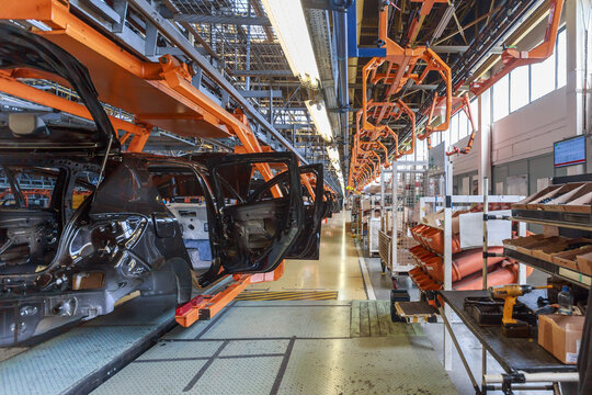 Head engineer and factory operator following product process on factory uses SCADA system and industry 4.0. Two operators controll assembly line using screens with human-machine interface