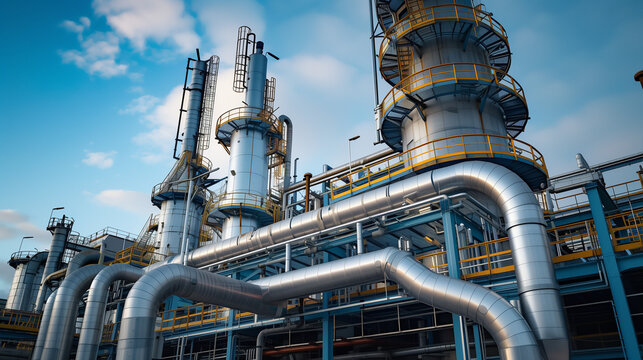Oil gas refinery plant. May called petroleum, production or petrochemical plant. Industrial factory construction from engineering technology with steel pipe, pipeline, tank. Business for power energy.