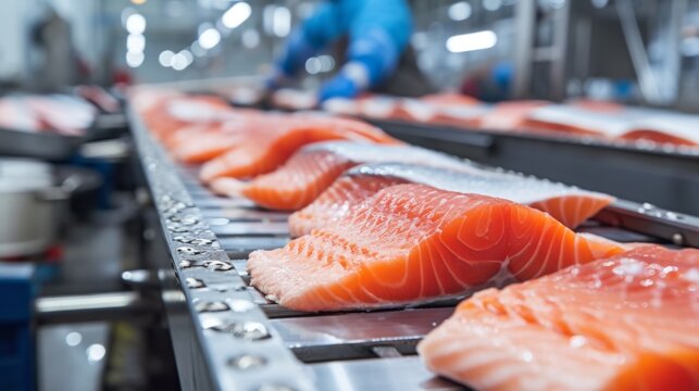 Fresh sea fish moving along a conveyor belt in a modern food processing plant