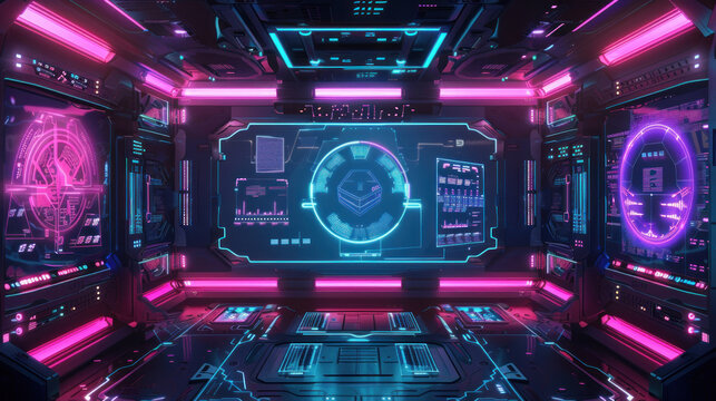 Dark analytics dashboard displaying neon data panels with cyan table, bar and area charts