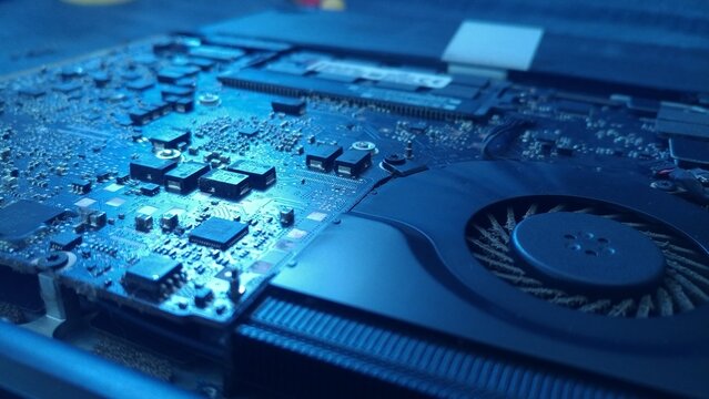 Futuristic electronic circuit board with blue glow