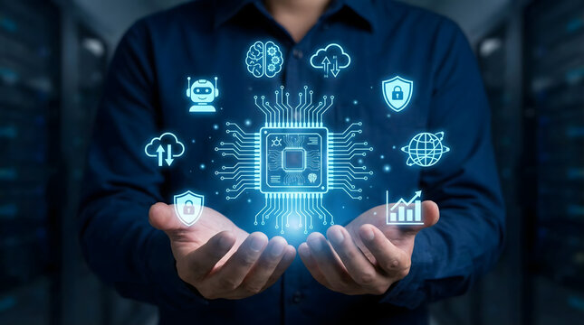 A developer holding a holographic AI sphere, surrounded by artificial intelligence, neural network, cloud computing, and automation icons, representing advanced technology and digital innovation.