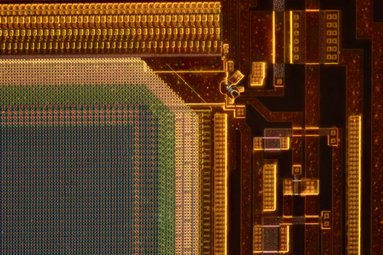 Close-up view of a microchip under a microscope, revealing intricate circuits and advanced technology, highlighting precision engineering in semiconductor manufacturing process.