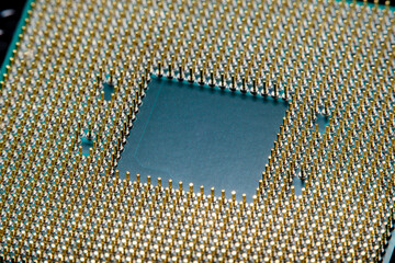 Close-up of a part of a microprocessor in soft focus under high magnification. Details of a computer component under a microscope.