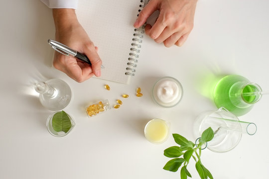 the scientist,dermatologist testing the organic natural product in the laboratory.research and development beauty skincare concept.blank package,bottle,container .cream,serum.